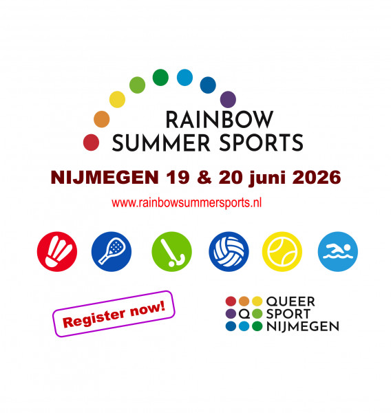 | Registration open for Rainbow Summer Sports 2026 - Nijmegen You can now register for the Rainbow Summer Sports tournament organised by Queer Sport Nijmegen on Friday 19 and Saturday 20 June 2026. We are once again aiming for a sporting and, above all, enjoyable tournament. Register as soon as possible. We start on Friday evening, 19 June, with a padel tournament. On Saturday 20 June, badminton, beach volleyball, open water swimming, tennis and hockey are on the programme. At various locations in Nijmegen, you can let loose and take sporting revenge in your favourite sport…:) Join us at the dinner and party after the sports. |