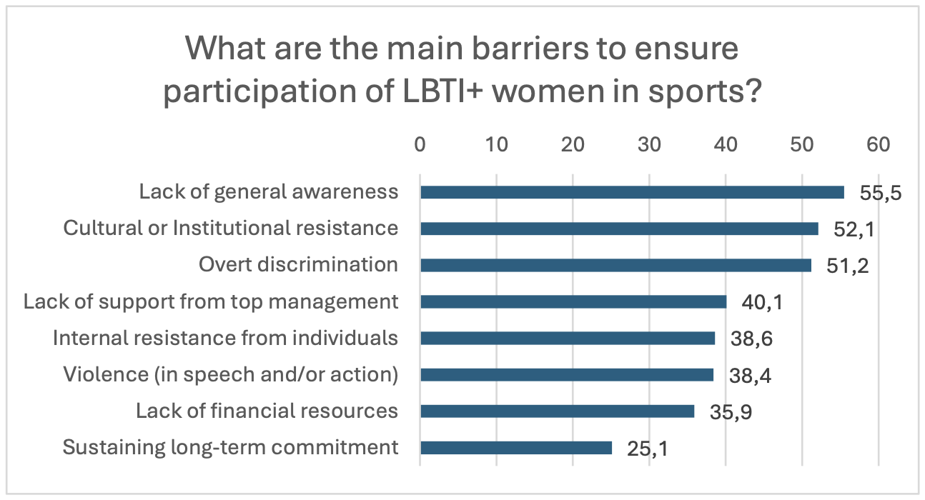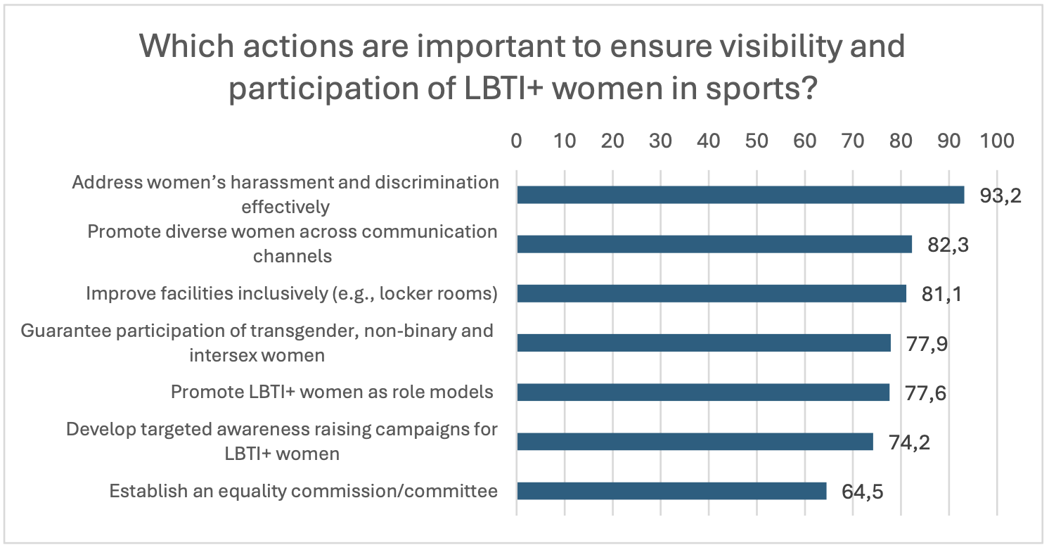 Participants described sport as a space for empowerment, community, and healing, but also one constrained by male-dominated structures, financial exclusion, and persistent transphobia and sexism. FLINTA initiatives emerged as vital safe spaces where LBTI+ women could express authenticity, solidarity, and joy. However, participants consistently called for institutional reforms: more inclusive governance, representation of diverse women in leadership, visibility of trans and intersex athletes, and sustained support for LBTI+ women-led projects. Together, the data and testimonies affirm that inclusion in sport requires not only participation but structural transformation, ensuring that all women, in their full diversity, can belong, lead, and thrive.
